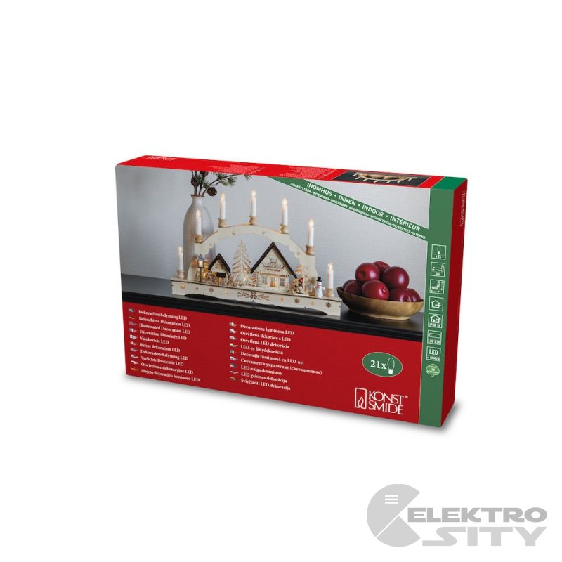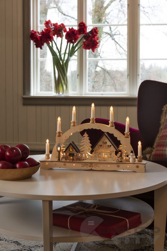 Vyřezávaný dřevěný adventní svícen 3254-100 s motivem HÁJOVNA od švédského výrobce KONSTSMIDE.