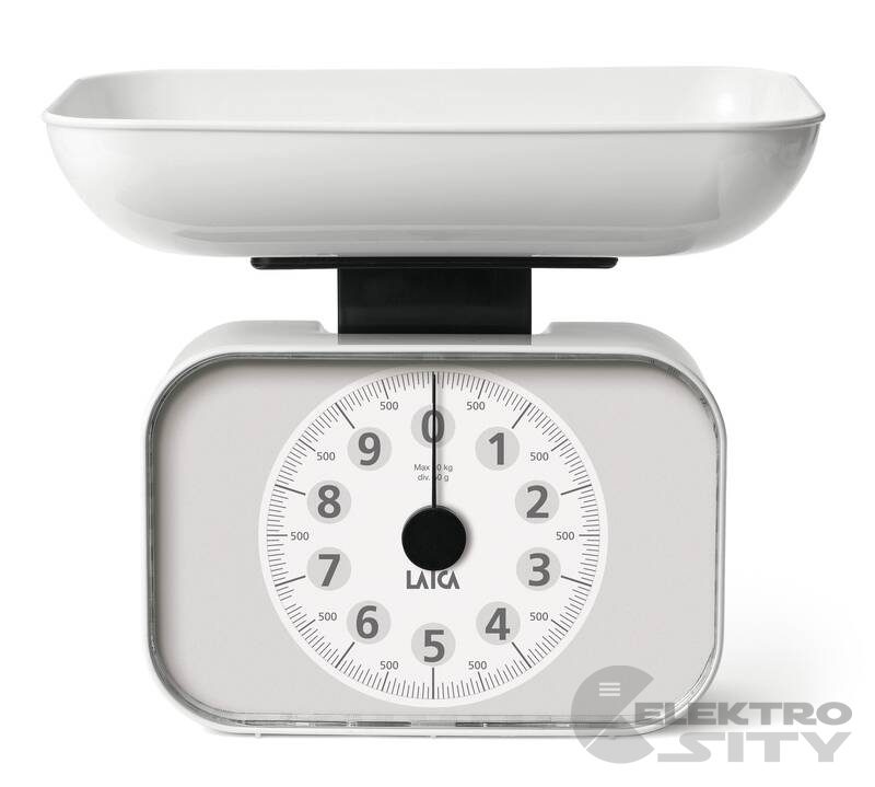Mechanická váha Laica KS2001 v čistém bílém provedení a retro designu.